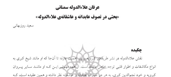 یا در مقاله زیر در یک مجلّه علمی - تخصّصی با عنوان : عرفان علاء الدّوله سمنانی«بحثی در تصوّف عابدانه و عاشقانه علاء الدّوله»(23) که نویسنده بسیار دلدادگی خود را به این شخصیت در قالب نوشتار بیان کرده و محوریت مقاله خود را همان کتاب «عُروَه» ذکر نموده است. باید از نویسنده محترم پرسید آیا دشمن امام زمان(عج) از مفاخر استان سمنان است؟
